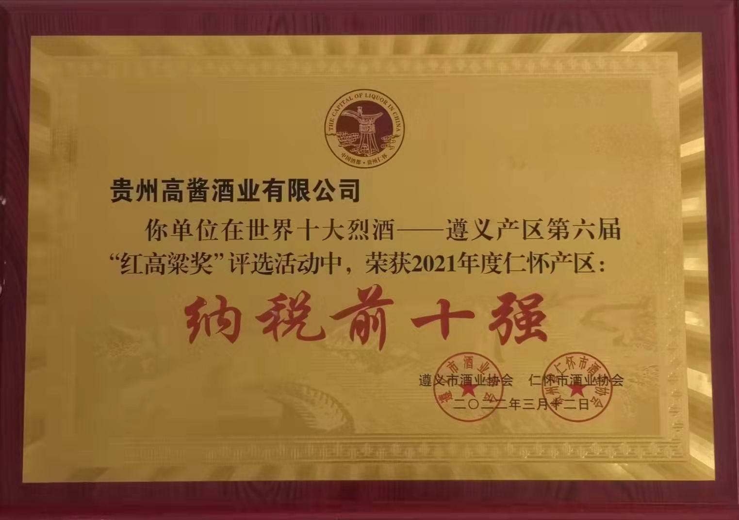 半岛·官方端网页版登录入口-半岛(中国)股份旗下高酱酒业坐落于贵州省仁怀市名酒工业园区。作为贵州省仁怀市酒业协会副会长单位、中国酒都仁怀白酒企业100强,高酱酒业目前已是贵州仁怀地区规模生产以上及主要纳税单位,2021年纳税额达到1.2亿元人民币。根据仁怀市酒业协会今年3月1日的公示,高酱酒业被评为世界十大烈酒——遵义产区第六届“红高粱奖”2021年度仁怀产区纳税前十强企业。
